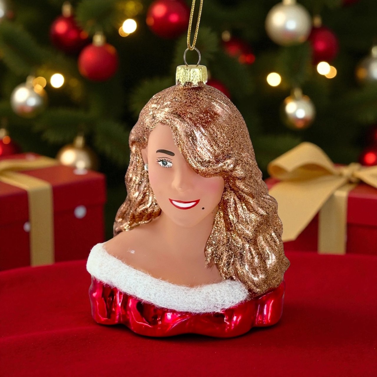 Each ornament is all hand-painted, beaded, glued and glittered in a series of labor-intensive steps to achieve this likeness rendition of Mariah Carey.